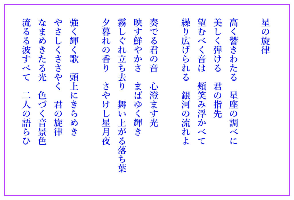 「星の旋律」は、音楽と自然、そして人と人との心の共鳴を、宇宙的な広がりの中で描いた叙情的な作品である。詩は、星座の調べや銀河の流れといった壮大なイメージから始まり、音楽が単なる音の連なりではなく、光や空間そのものへと変化していく様子を繊細に表現している。奏でられる旋律は、聴く者の心を澄ませ、鮮やかな輝きとして周囲の世界を映し出す存在として描かれており、音楽が精神を浄化し、新たな感情の世界を開く力を持つことが象徴的に示されている。