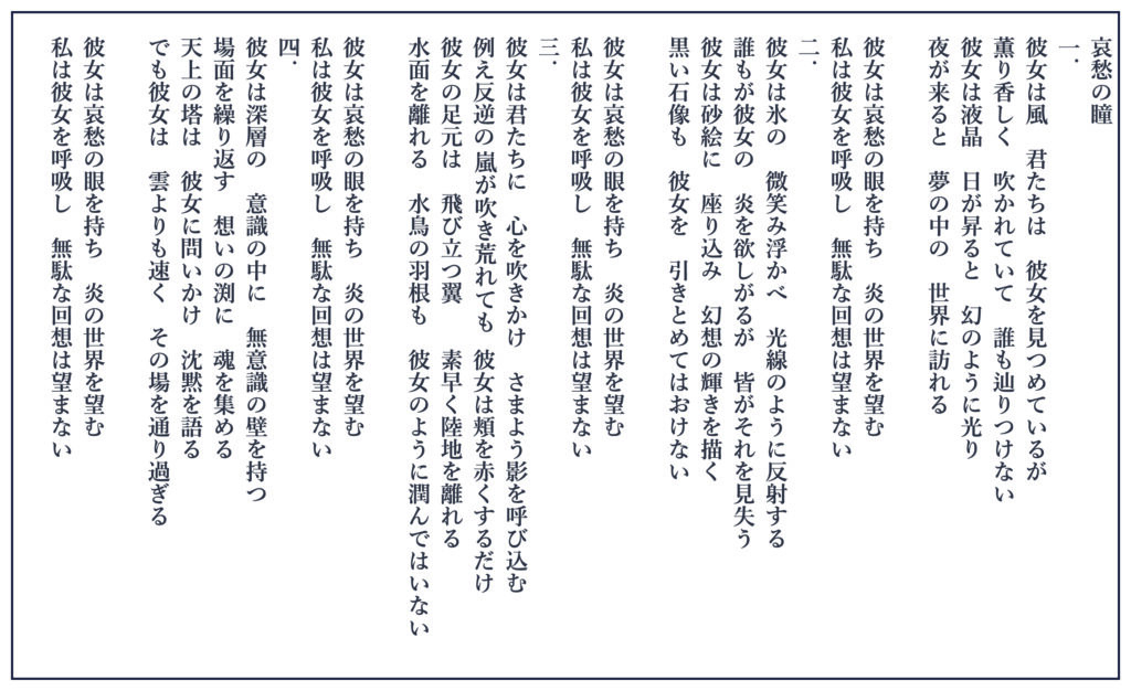 「哀愁の瞳」は、現実の人物像を超えた象徴的な女性像を通して、人間の内面に潜む憧憬や喪失感、そして到達し得ない理想への想いを描いた幻想的な叙情詩である。作品に登場する彼女は「風」や「光」、「氷」や「翼」といった多様な自然・物質の比喩によって表現され、常に近くに感じられながらも決して手の届かない存在として描かれている。その姿は、現実の恋人というよりも、精神の深層に宿る理想や記憶、あるいは芸術的なインスピレーションそのものを象徴していると言える。