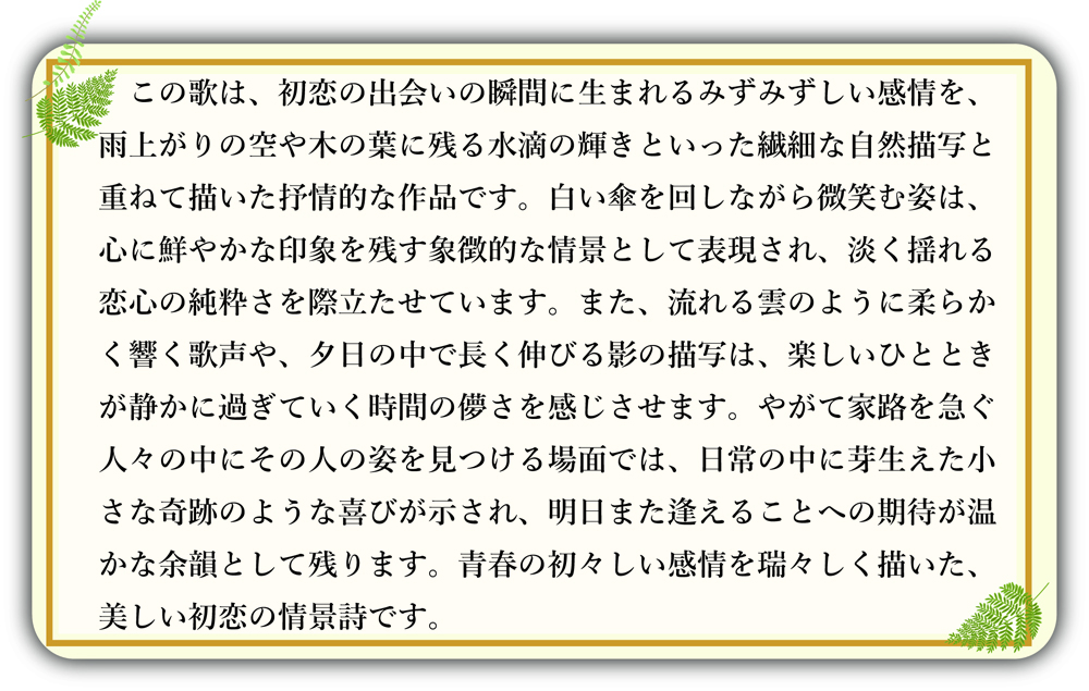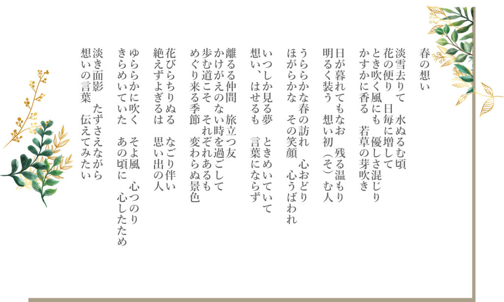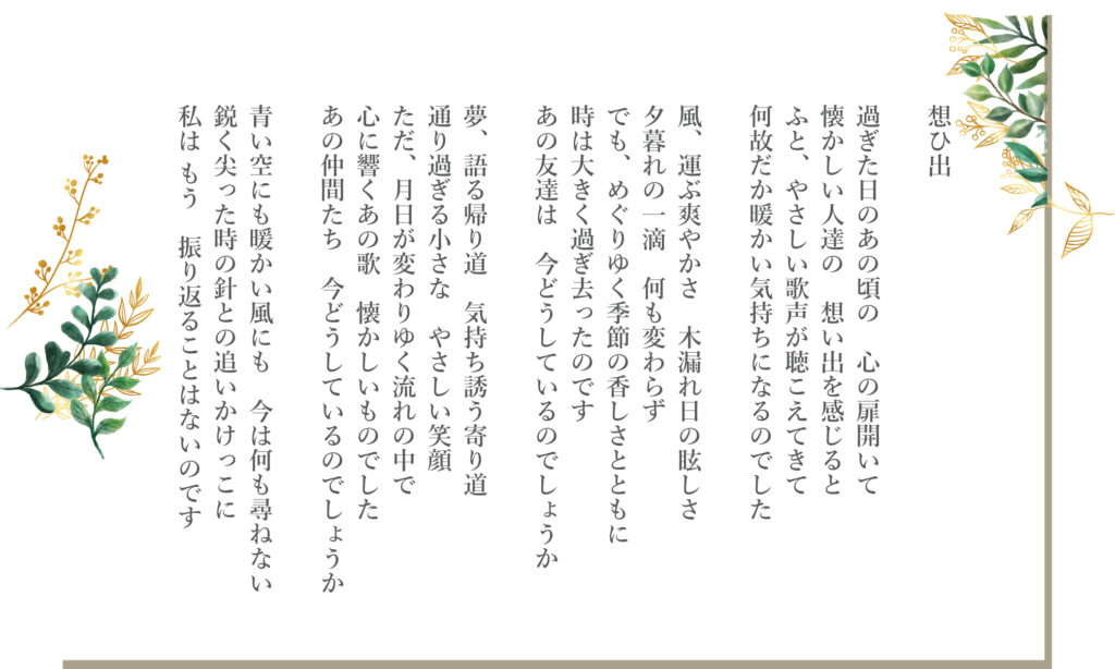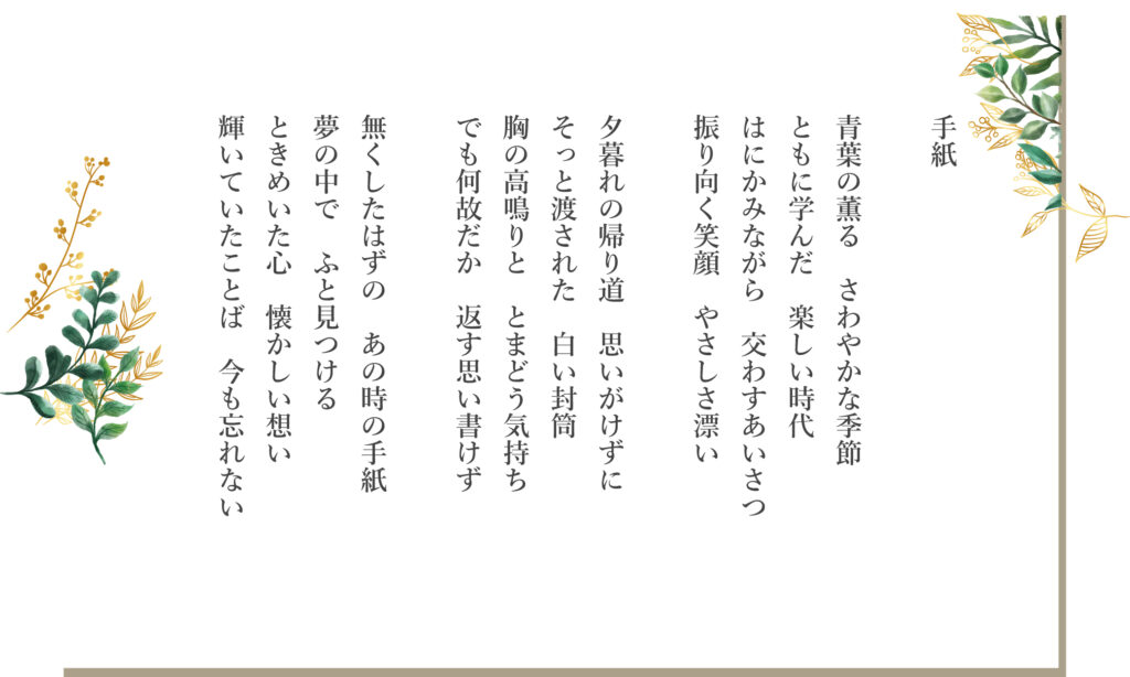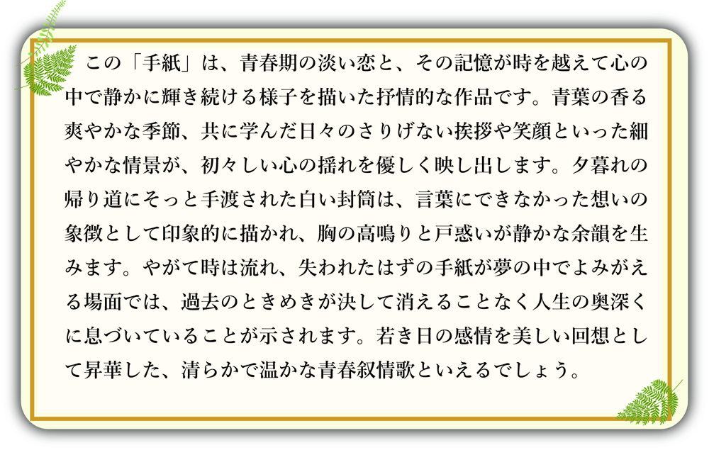 ハート先生の音楽作品集(懐かしさシリーズ) 2026.03.21 これらの楽曲はすべてハート先生のオリジナル作品で、そのため、これらの曲を使用する場合の権利関係(JASRAC等)の問題は一切、発生しませんので自由に演奏できます。ここではハート先生の仲間のプロの声楽家・歌手の方々が歌っています。 手紙