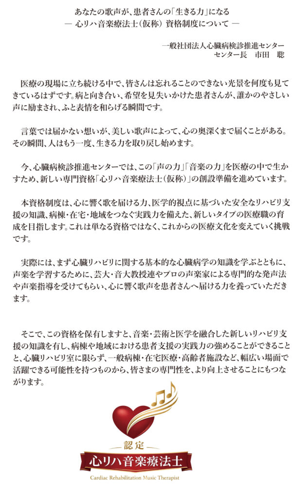 「心リハ音楽療法士(仮称)」の資格認定制度 2026.03.20 現在、制度設計中 本年6月より活動開始します。 本企画についての、ご意見、ご質問などあれば以下のメールからお寄せください。 お名前 メールアドレス メッセージ